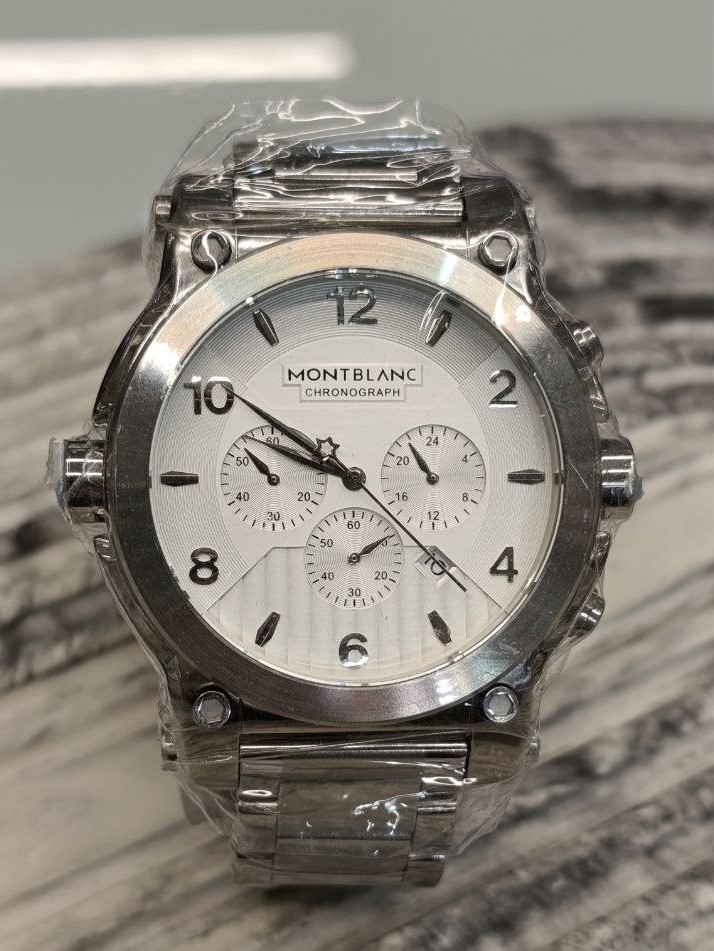 ساعت مردانه خاص از برند مونت بلنک MONT BLANC کرونوگراف فول استیل تقویم و تاریخ فعال 3 موتور فعال موتور کیفیت عالی ژاپنی سایز بزرگ و سنگین